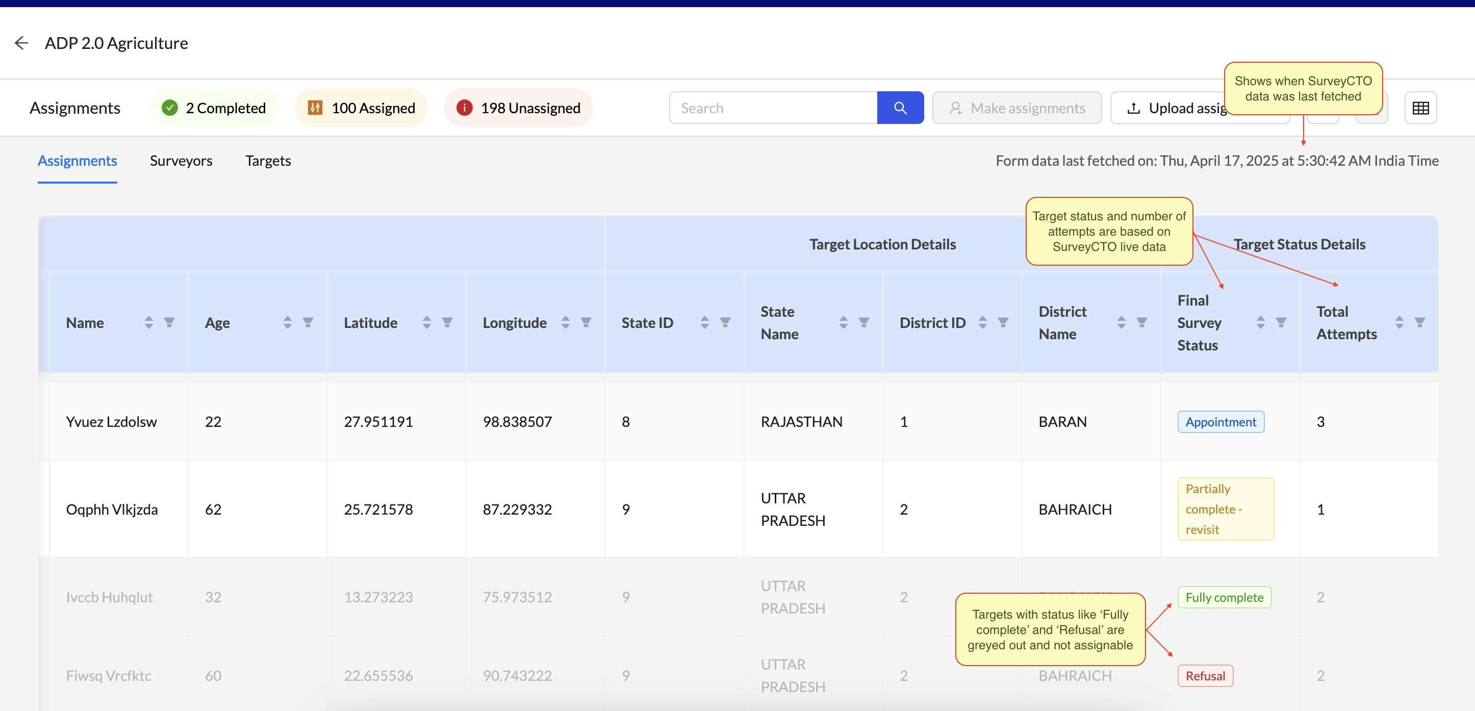 - If incoming data from SurveyCTO like target status, number of visit attempts, revisit appointment times, or surveyor productivity needs to be referenced when making assignments, SurveyStream creates efficiencies every time your team would have needed to download the data from SurveyCTO, run some analysis code, and put the output into a format where it can be referenced for the assigning process.