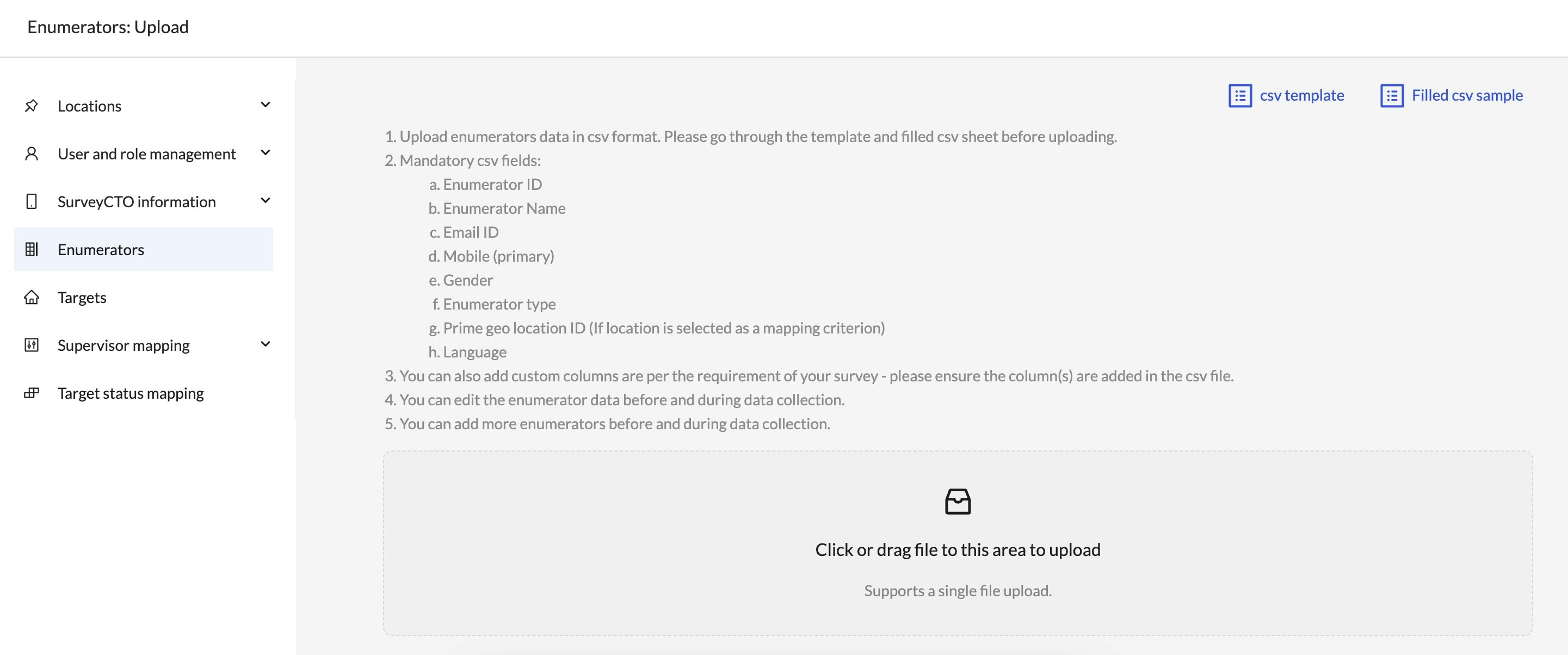 I want to start freshUse this action with caution as it will remove all existing enumerator data, replacing it with data in the csv file. Please note that if enumerators are re-uploaded using this option, existing assignments data will also get deleted.