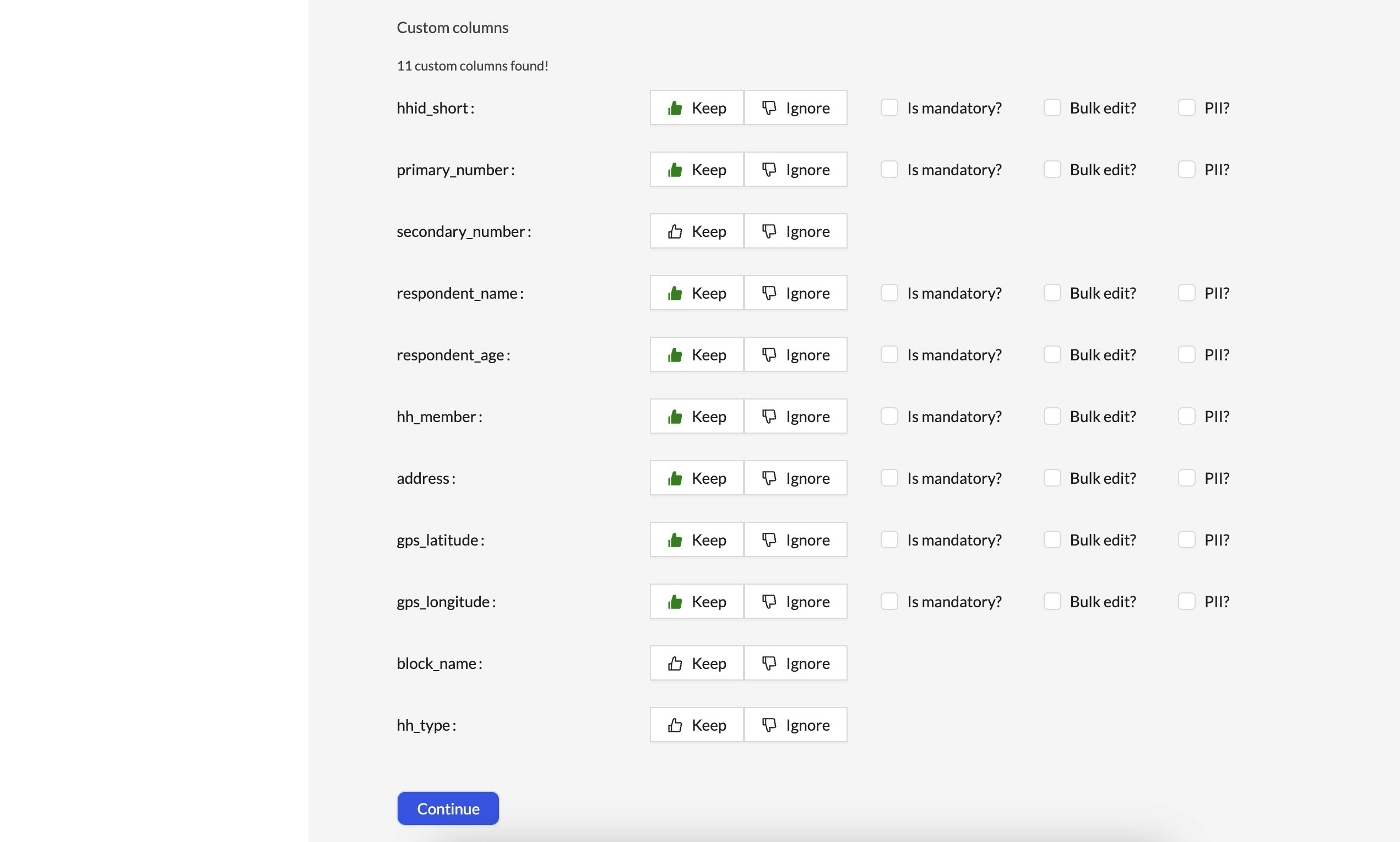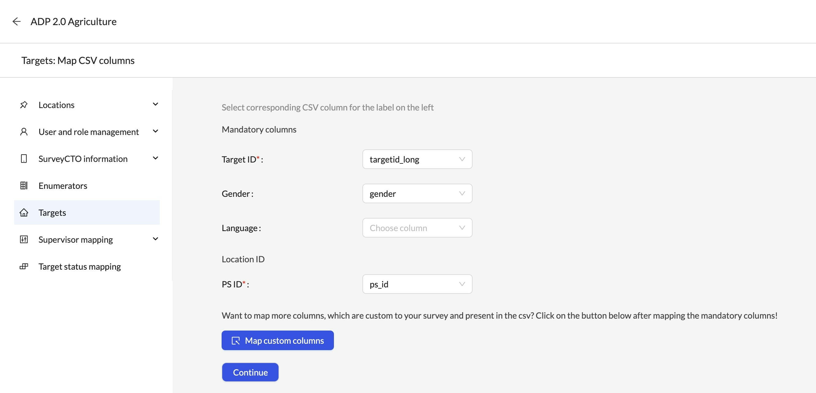 - Edit SurveyCTO column mapping: Can be used to update the mapping of the SurveyCTO form fields to the target fields on SurveyStream. This can be used to add any custom fields that are needed for downstream modules.
