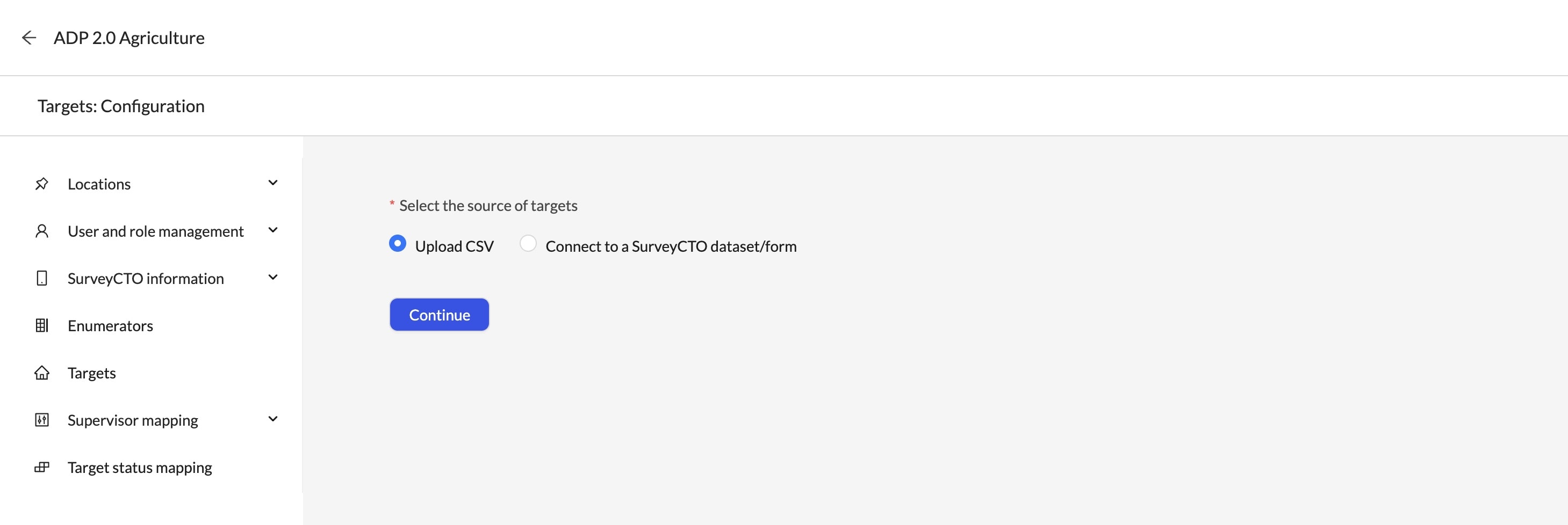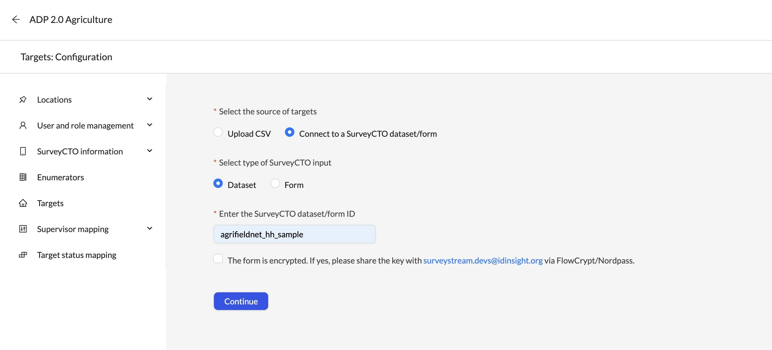 Configuring targets has the following prerequisites:- Configure the main form on SurveyStream. Complete the SurveyCTO Integration step on SurveyStream as targets are linked to the main form.